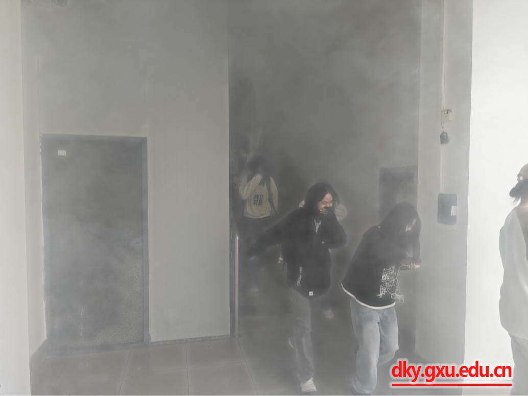 “演练开始!”模拟火场内顿时“浓烟弥漫”,参演学生纷纷弯腰低身,捂住口鼻,按照规划路线,快速、有序地撤离到安全地带。